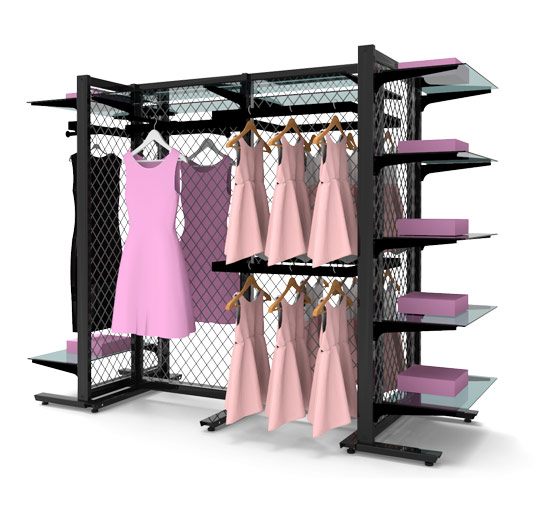 סטנד ויטארו רצפתי עם ראש גונדולה שני צדדים, עם תלייה צידית פרונטלית ומדפים, שחור