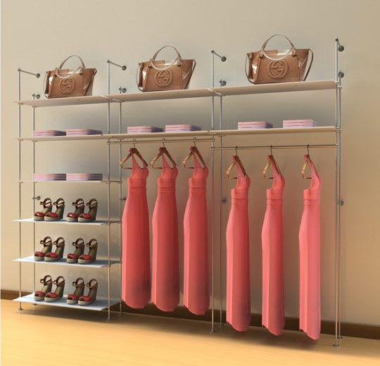 קיט צינור 12 ל 10 מדפי זכוכית או עץ ו 2 מסילות תלייה 90 ס"מ – חיבור קיר רצפה