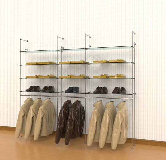 קיט צינור 12 ל 8 מדפי זכוכית ומסילות תלייה 90 ס"מ – חיבור קיר רצפה