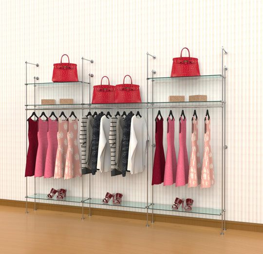 קיט צינור 12 ל 8 מדפי זכוכית ומסילות תלייה 90 ס"מ – חיבור קיר רצפה